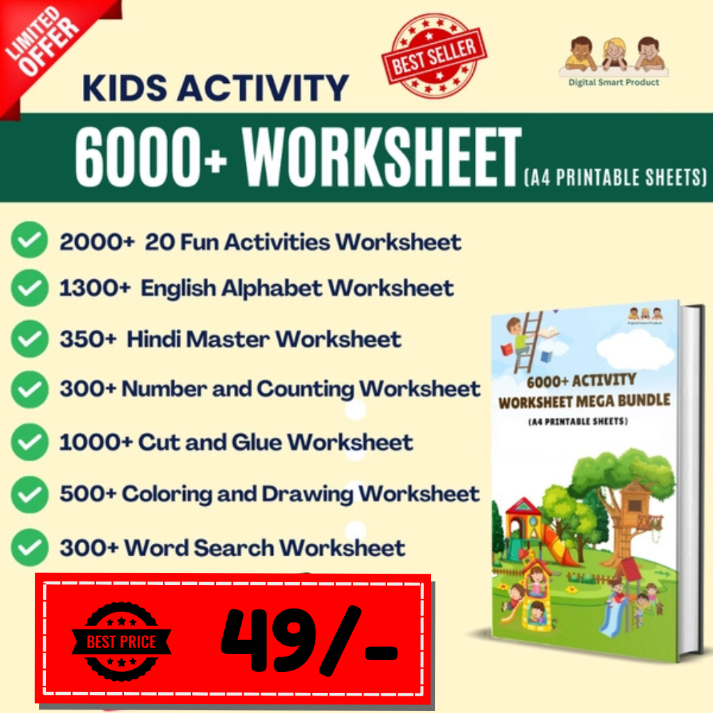 The 6000+ Worksheet Super Kids Bundle is the ultimate digital collection of printable educational and activity worksheets, designed to engage and develop essential skills in children aged 2 to 8 years (Preschool, Kindergarten, and early elementary grades).