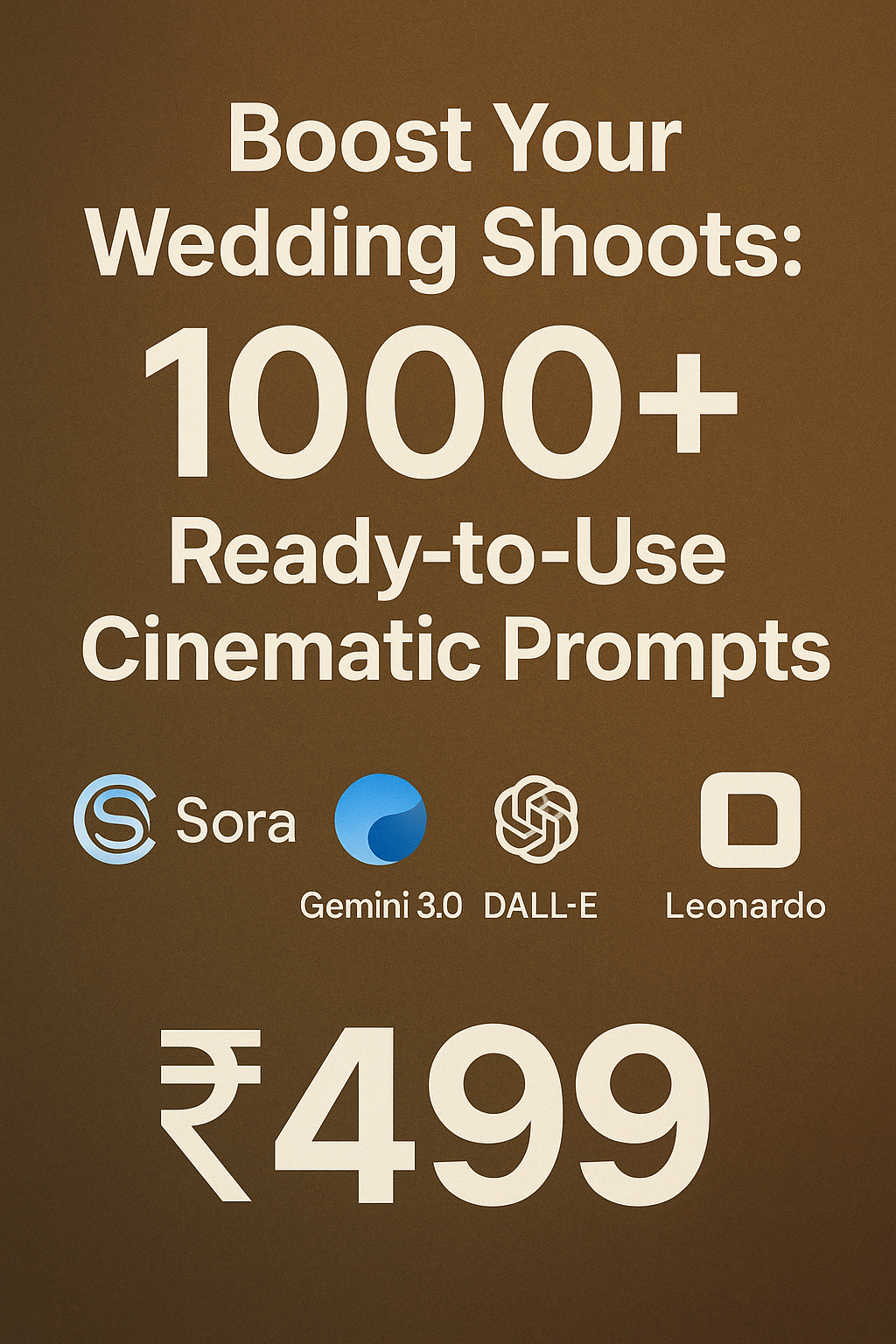Get 1000+ Ready-to-Use Cinematic Wedding Prompts — the ultimate toolkit for AI creators, photographers, editors, and designers. Create premium, emotional, big-screen style wedding images in seconds using Sora, Midjourney, Leonardo, DALL·E and more.